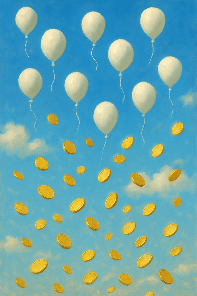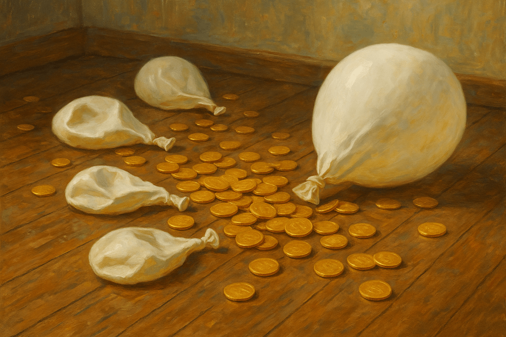 I released the balloons into the room, expecting them to rise. But they didn’t. They deflated mid-air, falling gently to the ground… and when they hit the floor, they transformed into coins.
