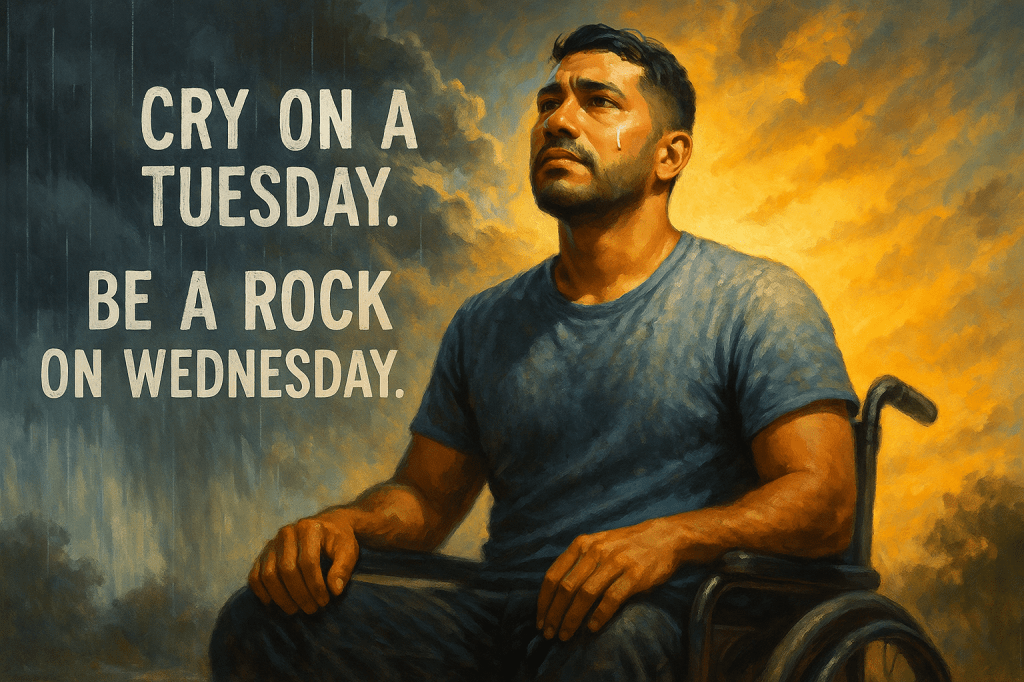 Turns out, I’m still strong—just in ways that don’t always show up in muscle. I protect my family with more than my back. I protect them with presence. With showing up, even when my legs don’t. With listening when I’ve got nothing else to give. With humor. With stubborn love.